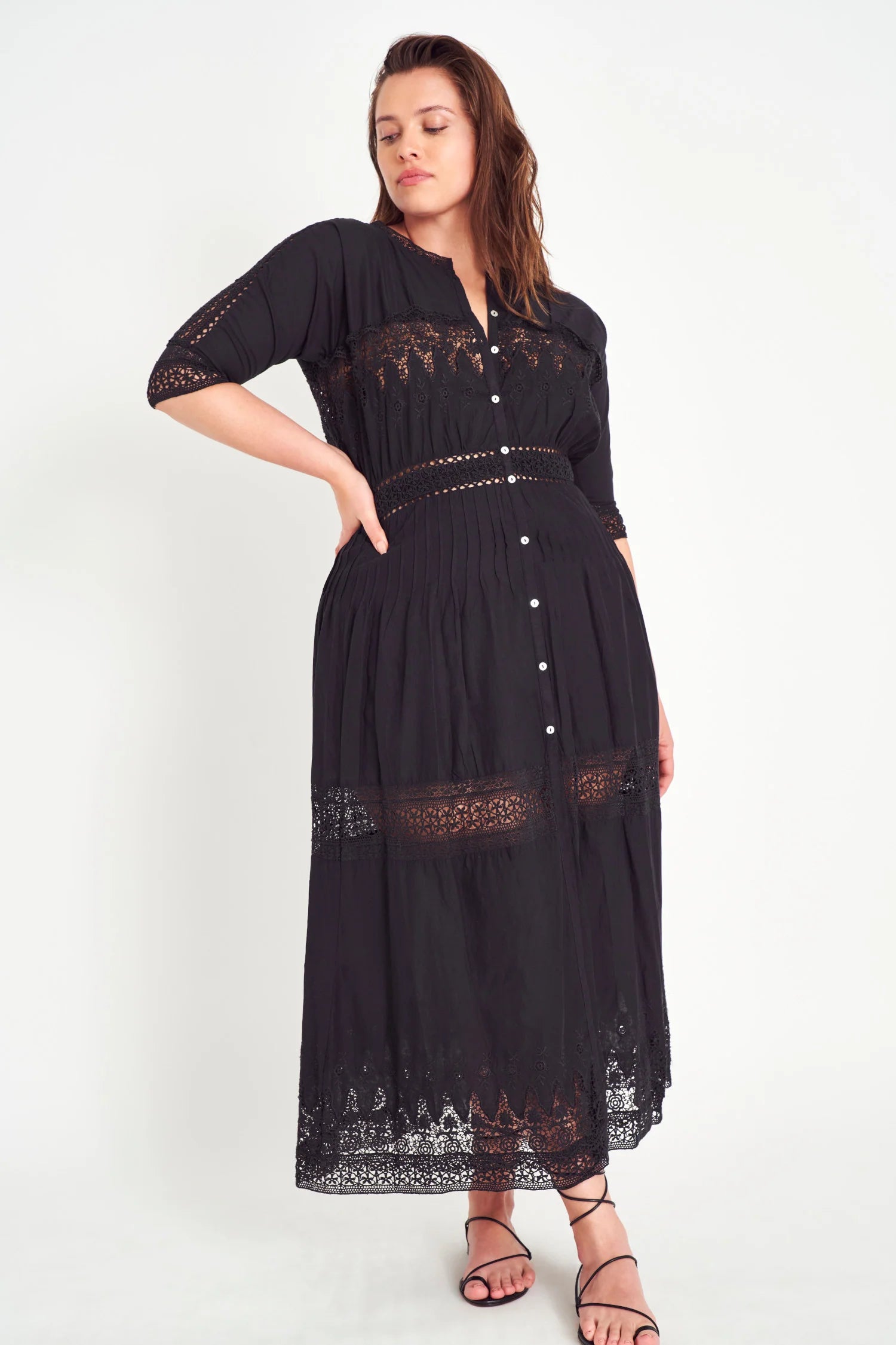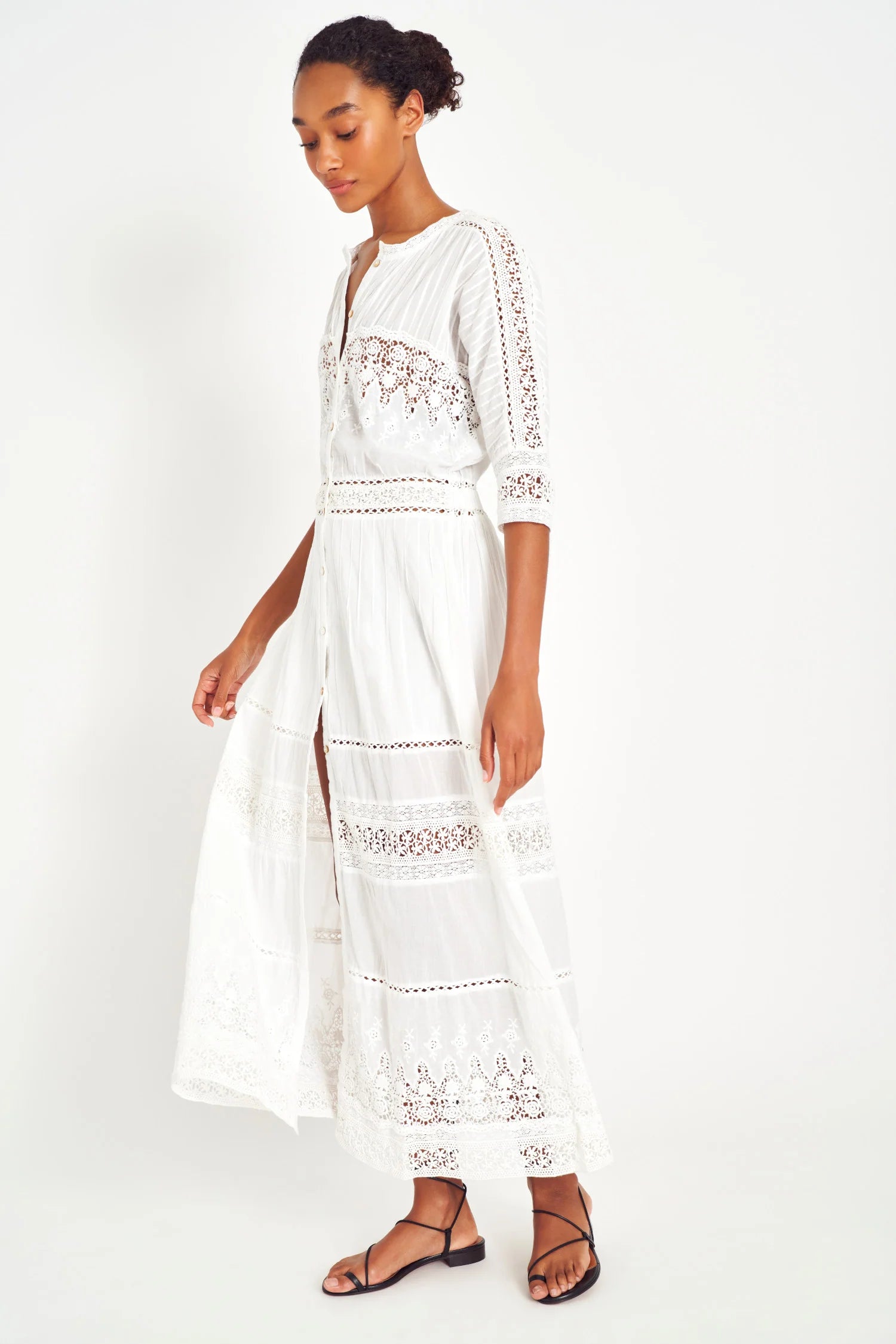 Our forever favorite Beth Dress is reimagined in airy hand-dyed cotton with elaborate panels of inset crocheted lace. This relaxed dress is perfect as a beach coverup or party dress. This dress features a crewneck, mother-of-pearl buttons descending at center front, cuffed elbow sleeves, and an easy flowing maxi-skirt. Comes with a half-slip.