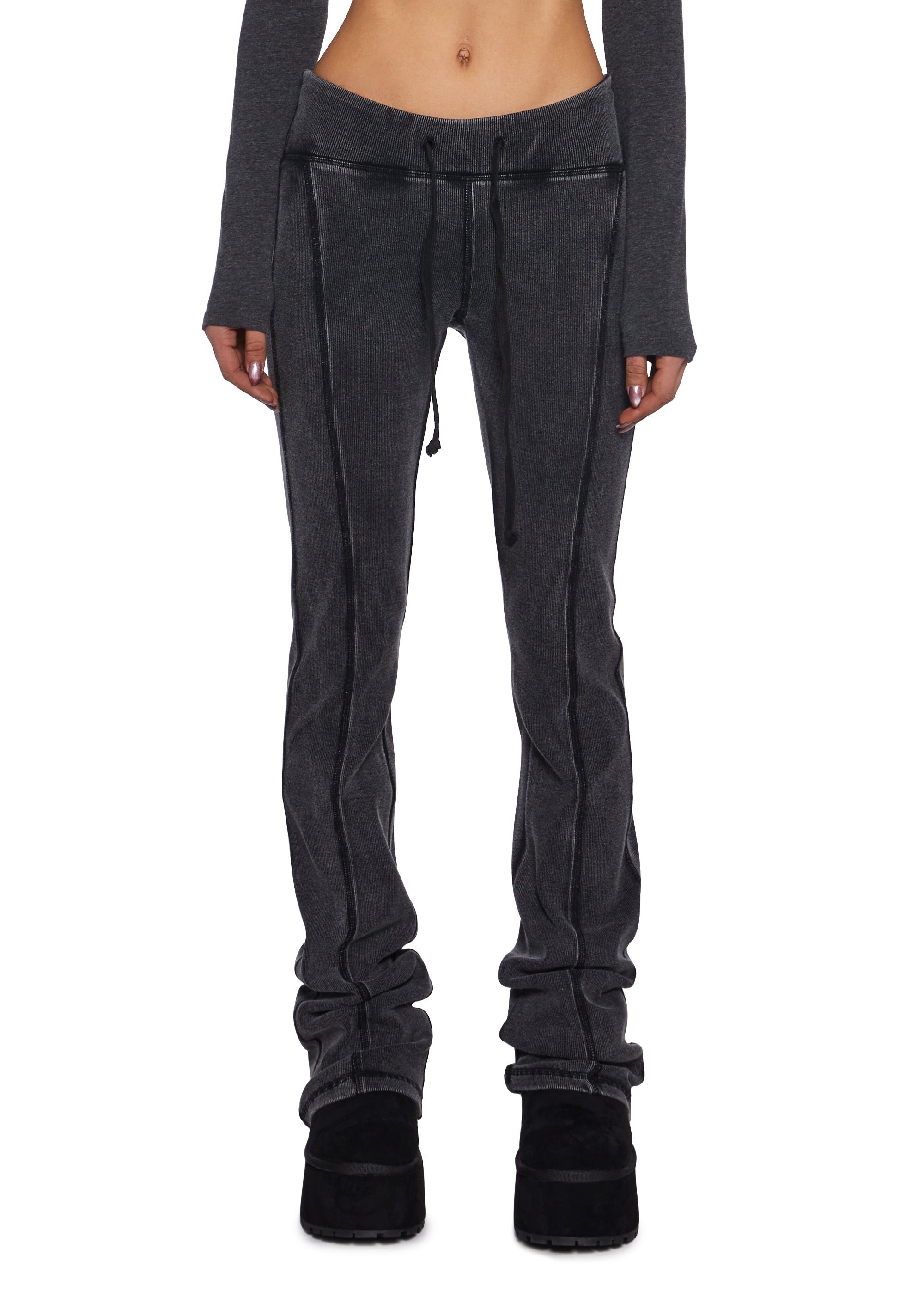 These pants have a washed ribbed knit construction, contrasting seamed details, a flared leg silhouette, and an elastic waistband with adjustable drawstring closures.