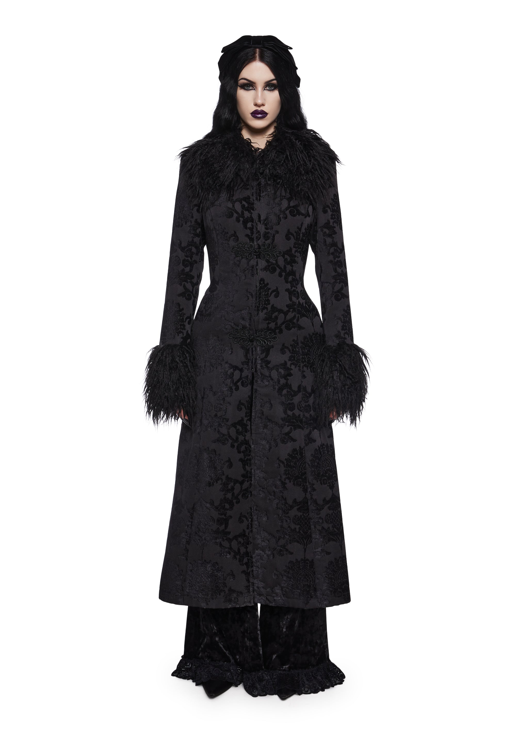This duster has a brocade construction with satin lining, long faux fur trim on the neckline and cuffs, side pockets, and a front zipper closure with embroidered lace loop closures.