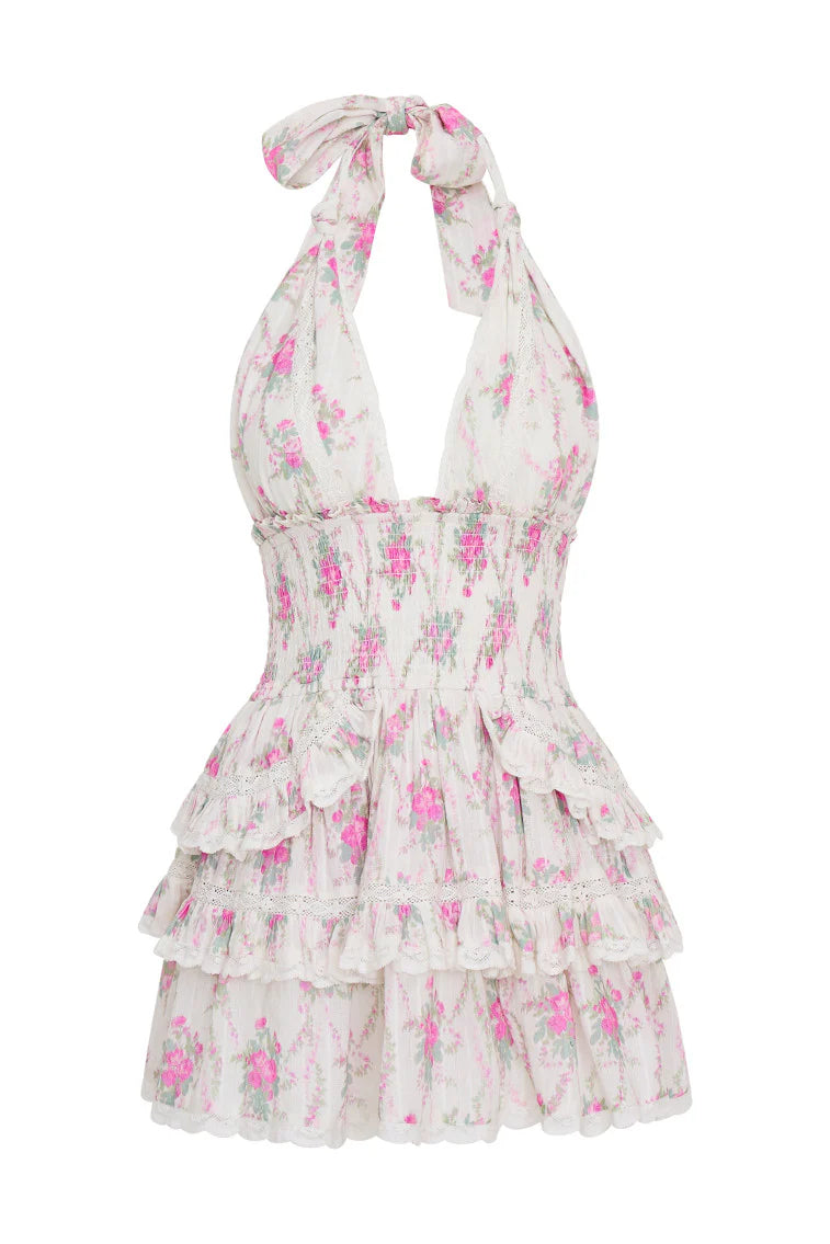 Everyone’s favorite Deanna Halter Dress returns with a flirty new floral print. This low-cut convertible halter ties in a generous bow at the neck and can be crossed at front. Below a wide smocked waistband, the skirt flares to smaller details at the hips and two ruffled tiers.