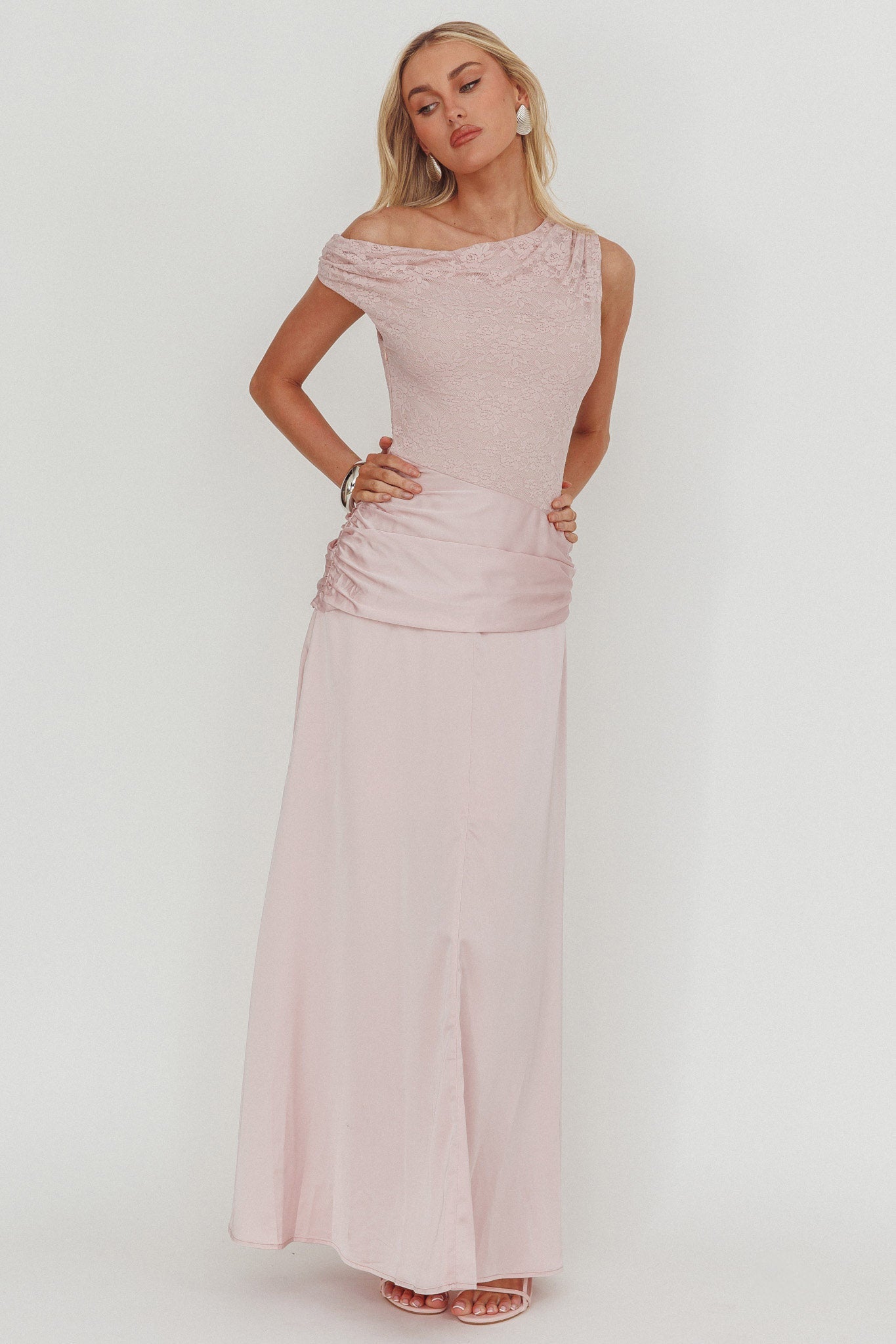 You'll be flooded with compliments in our stunning Diana maxi dress. It features a pretty, asymmetric neckline and lace bodice. It's perfect for a wedding or special event teamed with strappy heels and a purse for an elegant look.