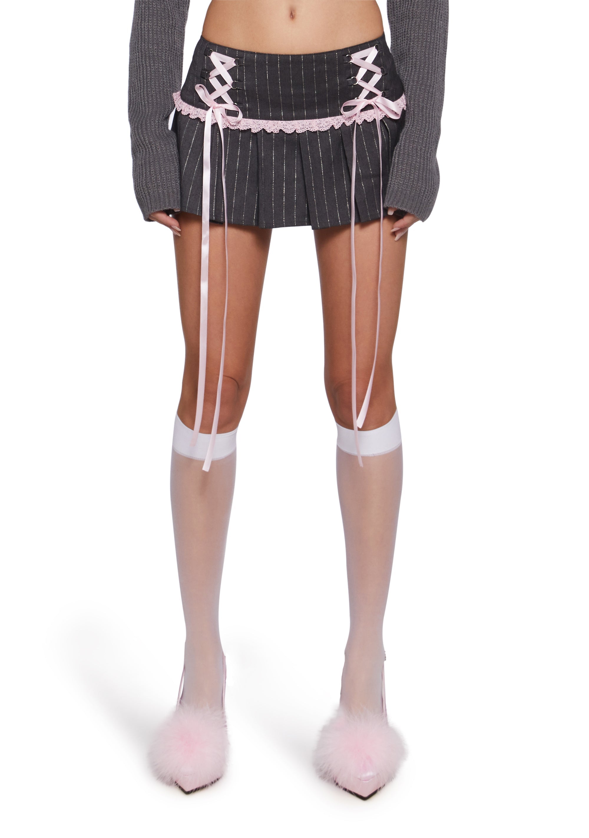 Read up on your fictional bae with this mini skirt that has a twill construction, a metallic pinstripe pattern, a pleated design, ribbon lace-up details on the front, a lace trim, and a side zipper closure.