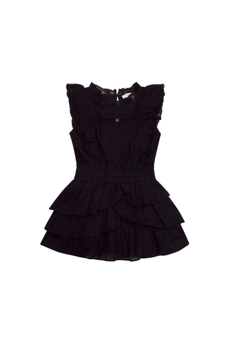 Our best-selling Decker Dress returns for our minis. This easy frock has a ruffle-trimmed collar, buttons down center front, flutter sleeves, an elastic waist and overlapping asymmetrical ruffles at the skirt.