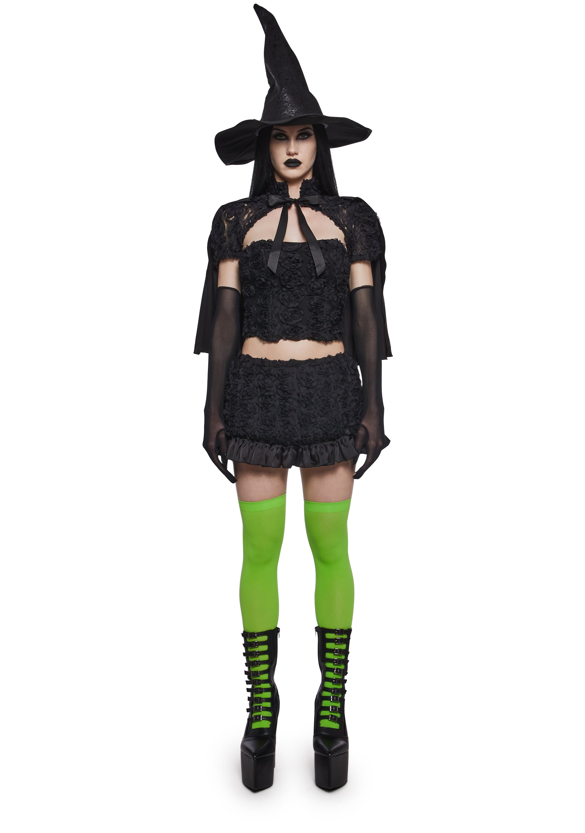Defy gravity in this costume set that includes a corset top, mini skirt, a short cap with front tie closures, pointed hat, arm warmers, and green thigh highs.