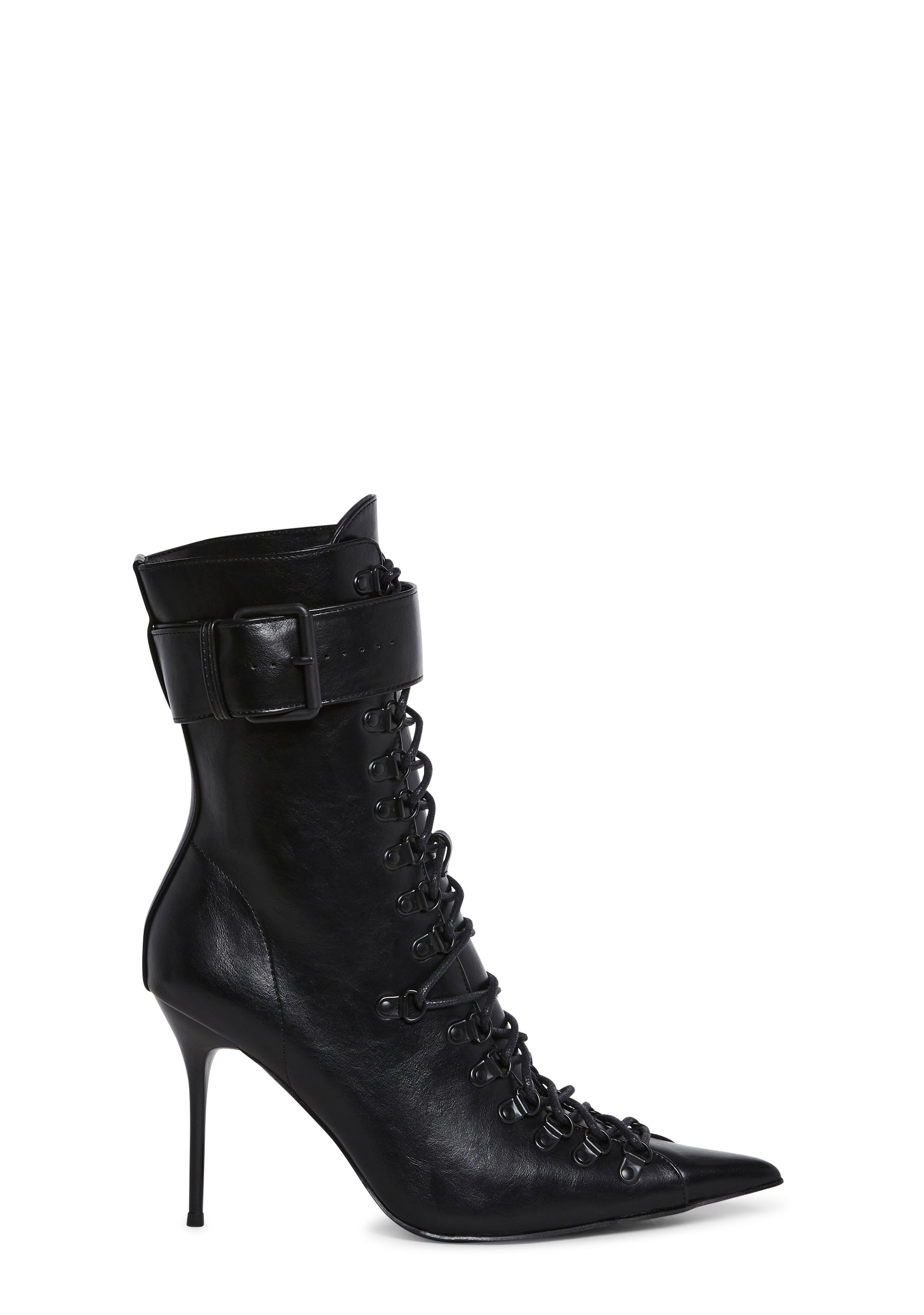 These boots have a vegan leather construction, a pointed toe design, stiletto heels, adjustable buckle closures, front lace-ups, and side zipper closures.