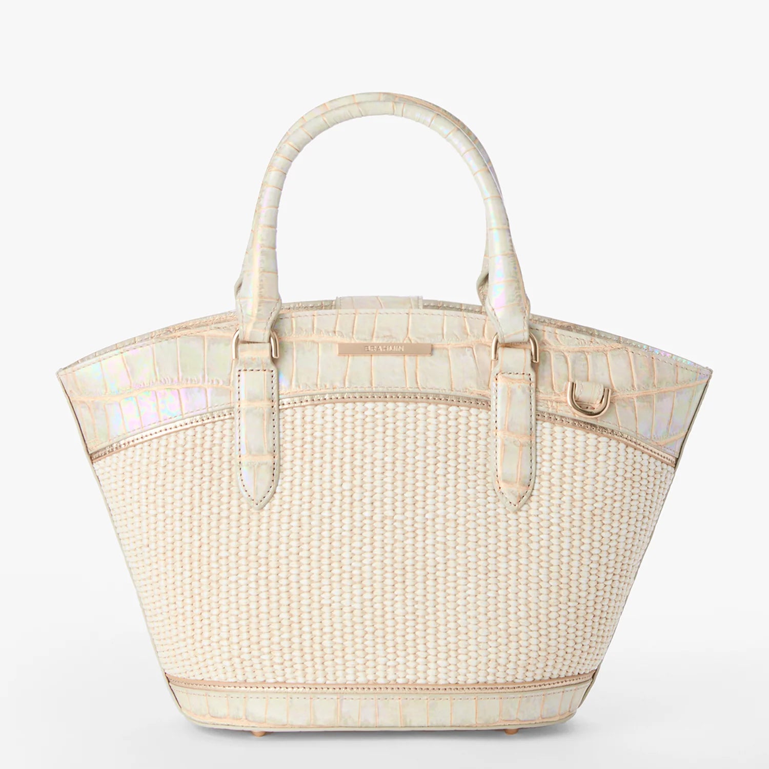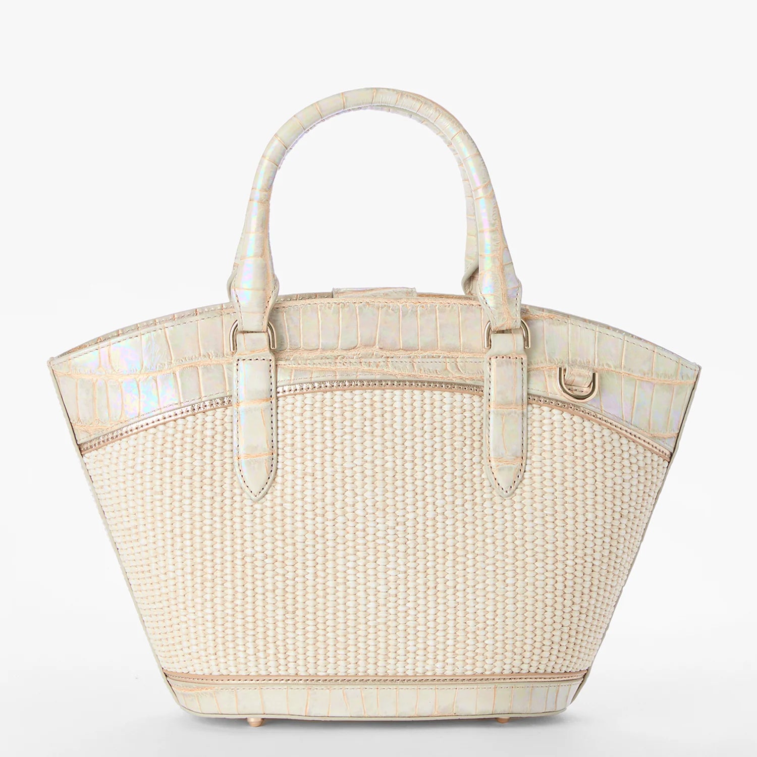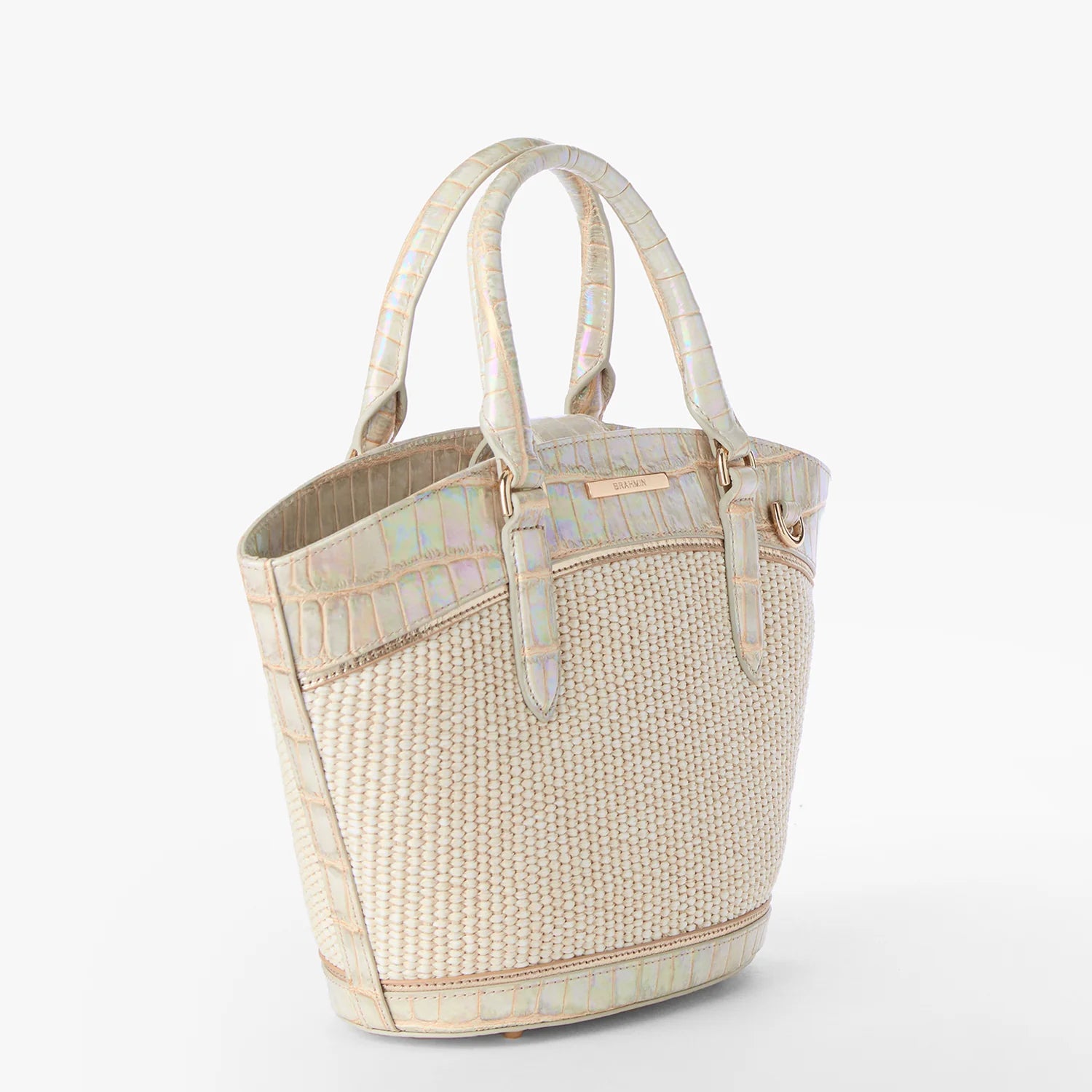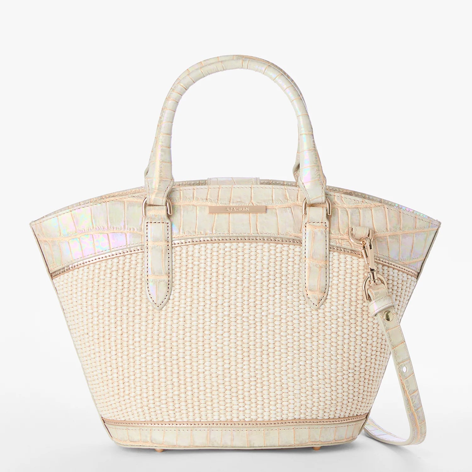 Featured in Tiramisu Manava, a playful twist on neutral. This combines a light natural woven with a flat croc in Tiramisu and a smooth metallic gold trim. The dynamic blend of texture adds dimension to this easy-to-wear neutral. Made with genuine leather.