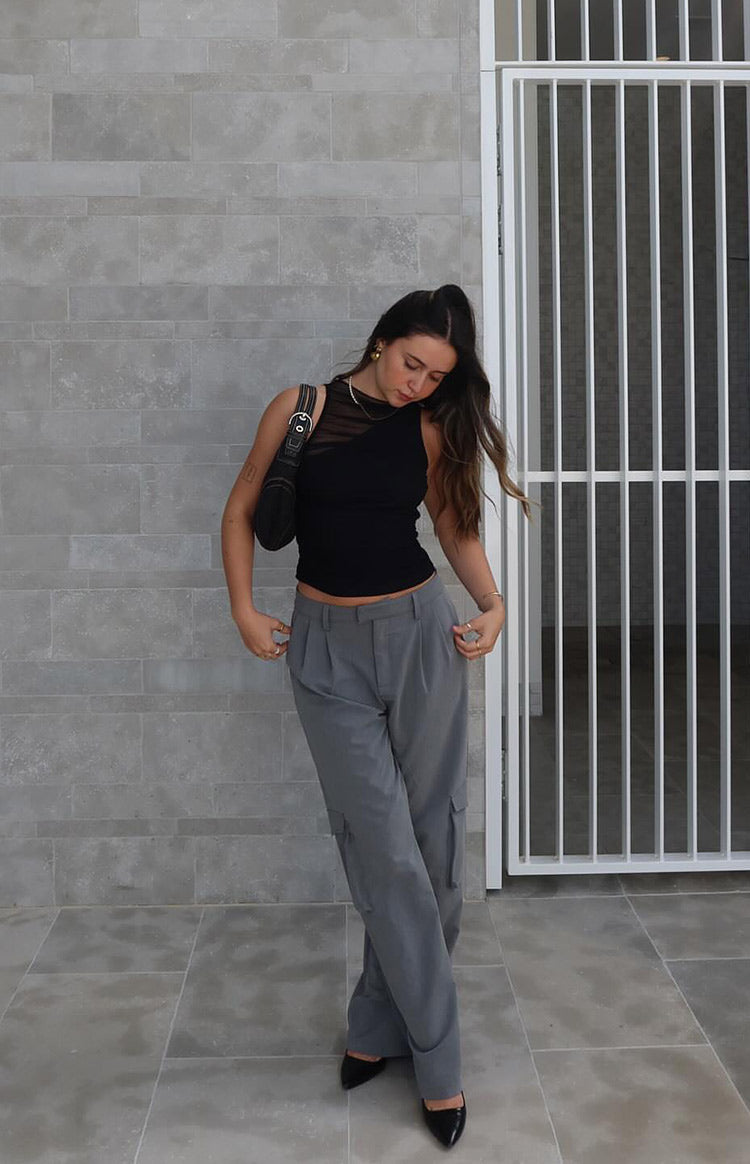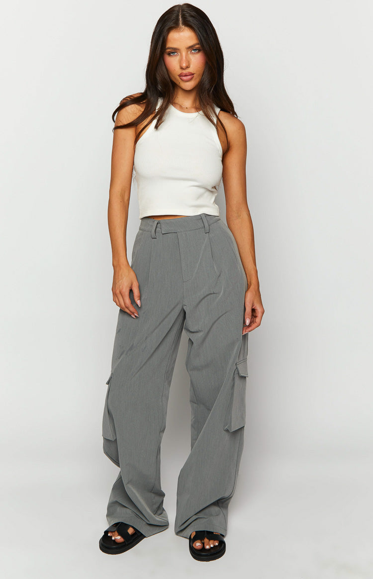 Elevate your wardrobe with our grey straight leg . Featuring a flattering high-waisted fit and cargo styled leg pockets design, these pants provide a sleek and structured look. Perfect for dressing with a and sneakers, these pants are a must-have.