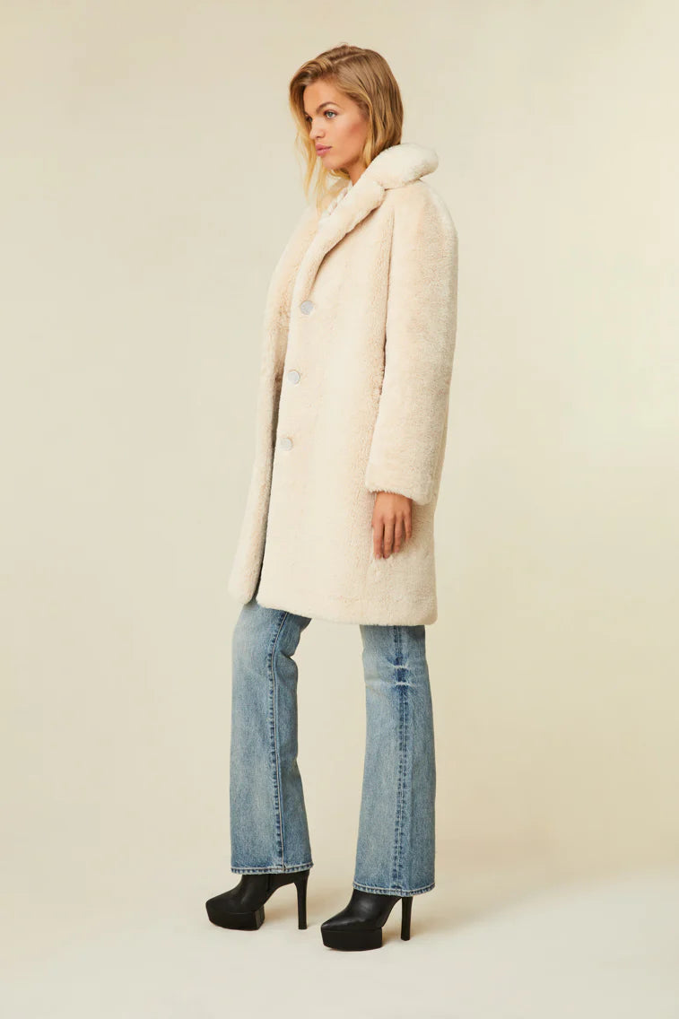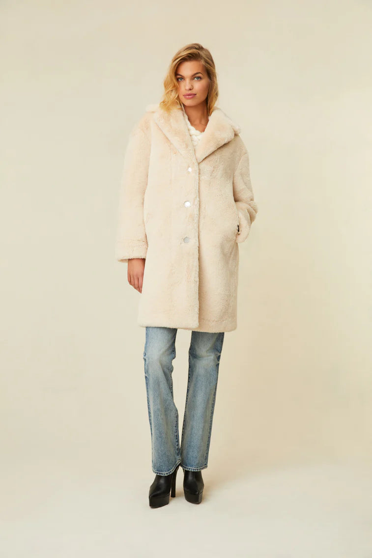 Stay warm (and chic) in the Kasami Jacket. This cozy outerwear layer is designed from a beautiful, bonded, faux fur shearling. The oversized jacket debuts in a posh blush color with three functional buttons down the center front.