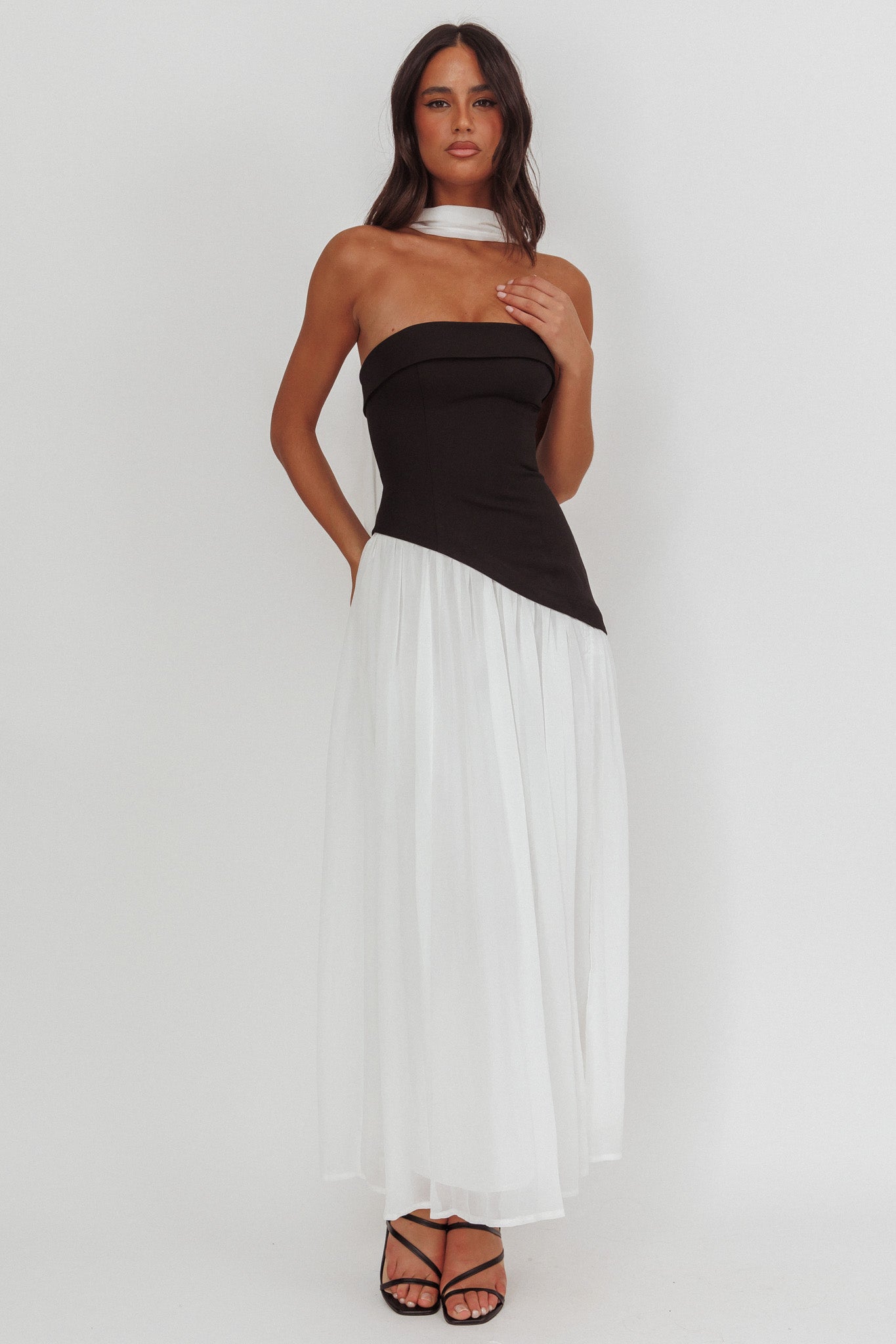 Steal the spotlight in our gorgeous Mariabella dress. We are in love with its contrasting bodice and asymmetric waistline. Wear it to a birthday soiree or special event teamed with black, strappy heels and a clutch for an unforgettable look.