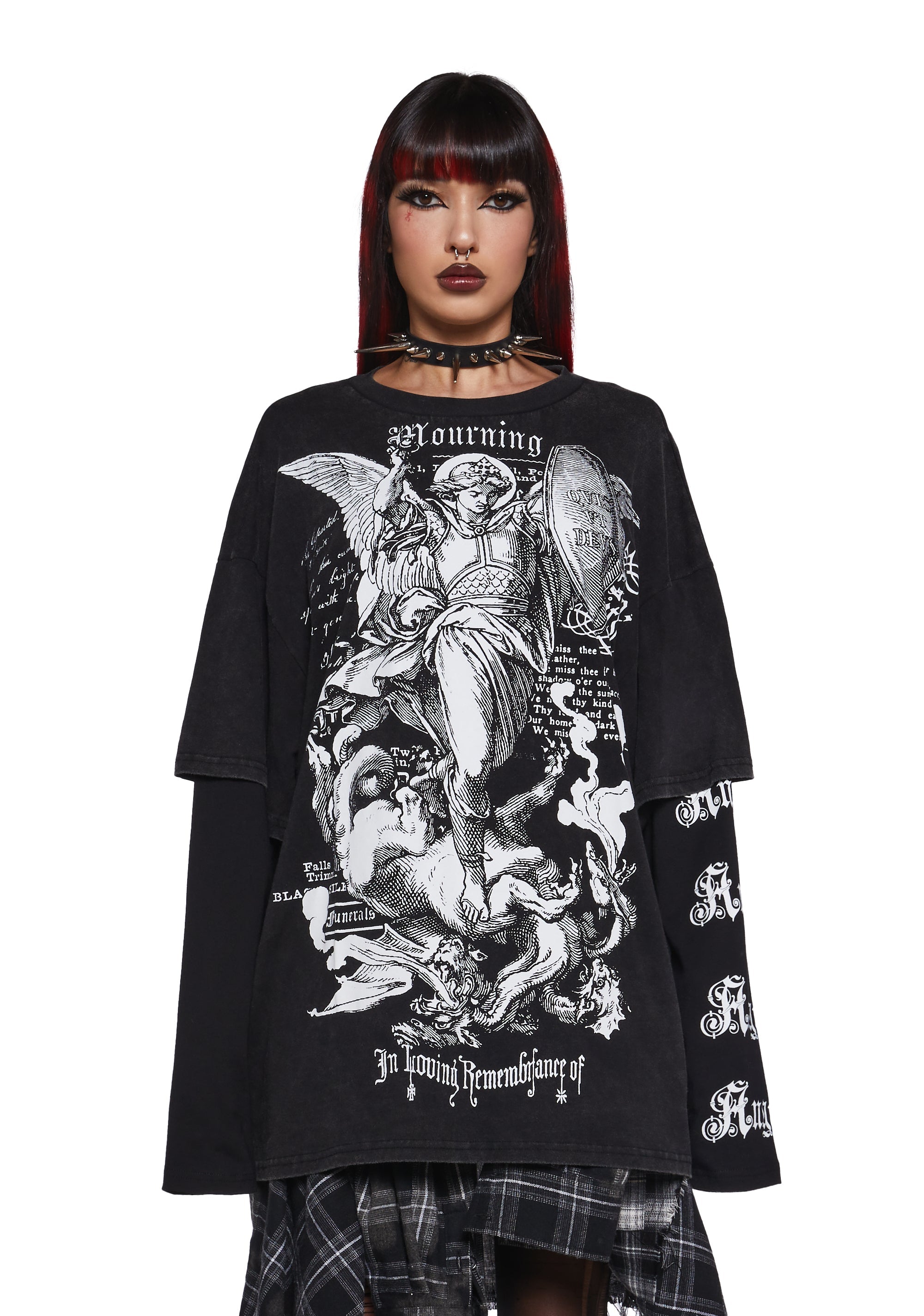 This top has a cotton construction, a washed finish, attached long sleeves with the words “Angel” on one sleeve, a graphic of an angel fighting a demon with the words “Mourning” on the front, and an oversized fit. This product has been pre-washed to create a vintage, worn-in look.