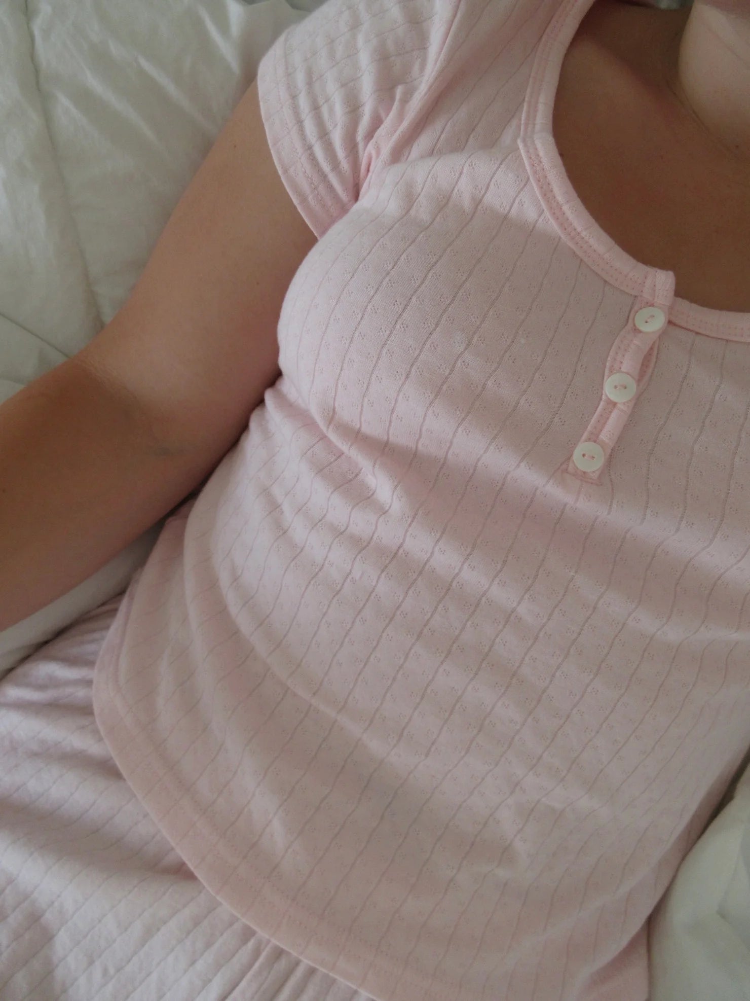 Fitted blush pink short sleeve top with a scoop neck and three buttons detailing.