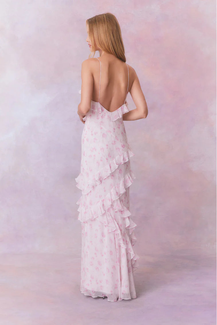 Designed for dancing, our Rialto Dress returns to match our fragrances in their dreamy prints. This must-have maxi stuns with a chiffon fabric and overlapping, asymmetrical ruffles at the neckline that continue to descend through the entire skirt. Slightly fitted, this dress features a sexy silhouette and includes a side seam zipper for closure.