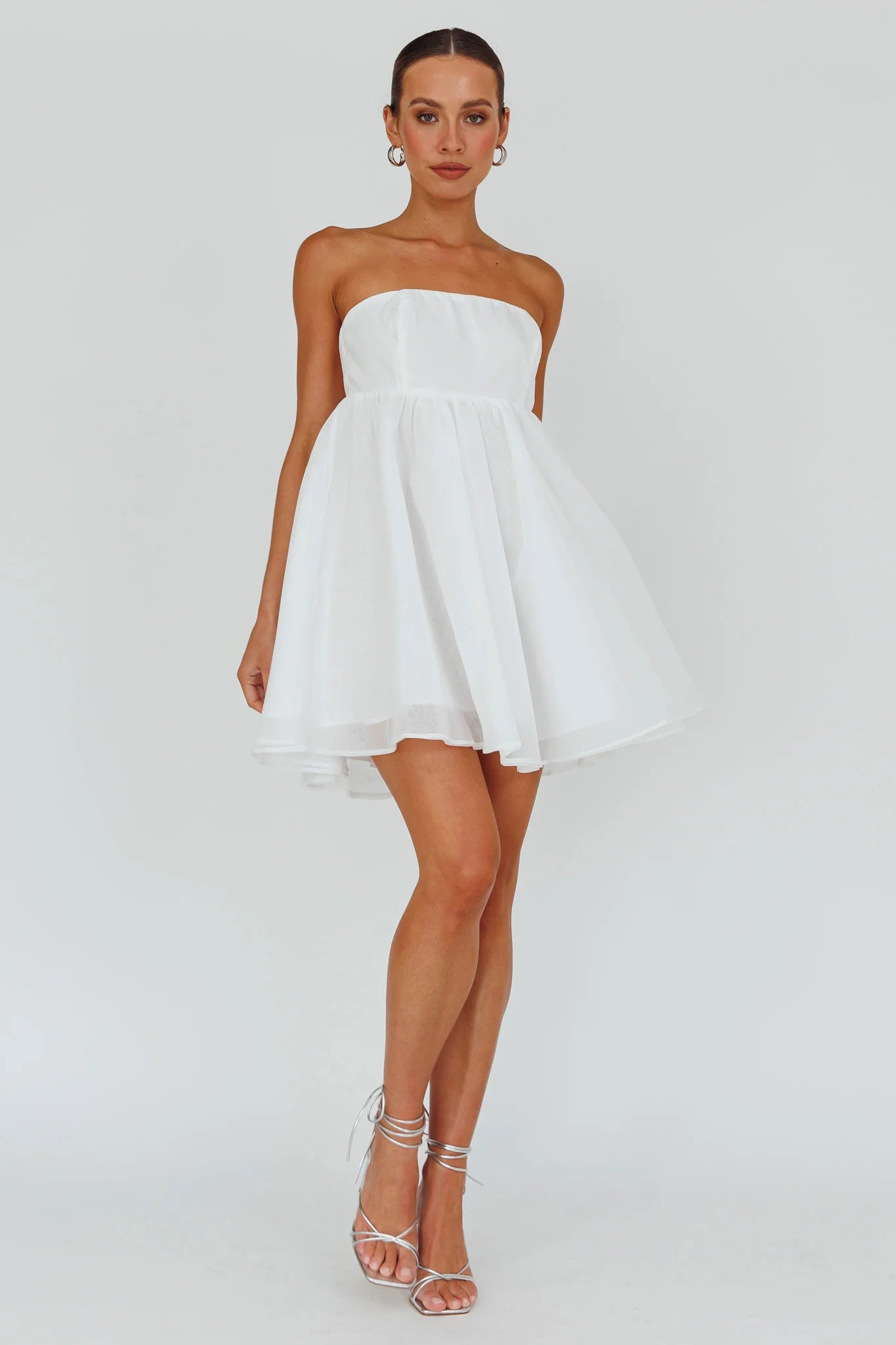 We've fallen head over heels for our pretty Solis mini dress. Featuring a girly, baby doll silhouette and strapless style. It's perfect for weekend brunch with your besties teamed with mules and a tote for a chic look.