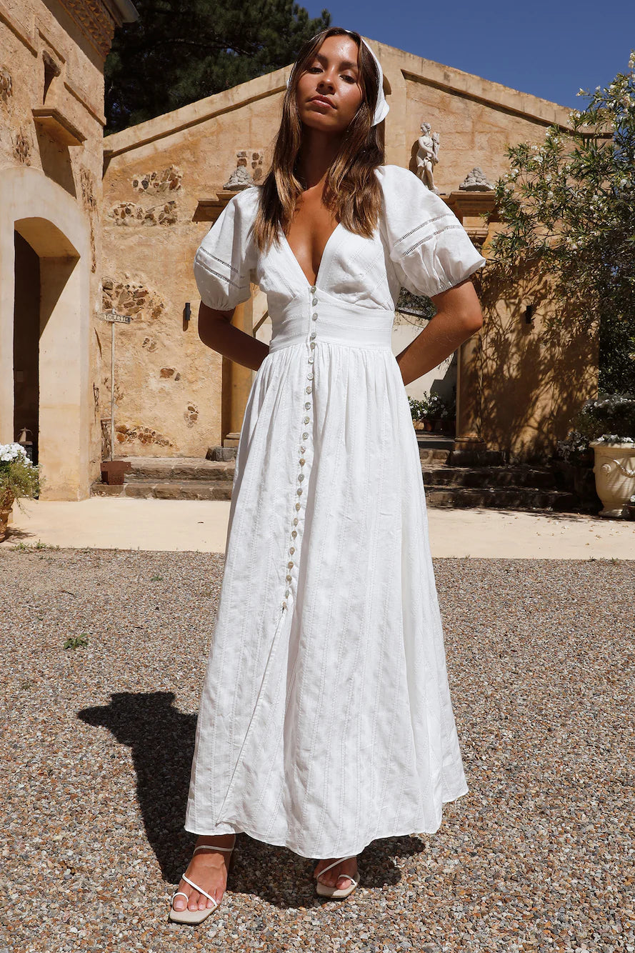 Feel the sun on your skin and the breeze through your hair in the Sunny Attire Maxi Dress in White. Style this dress with white sandals and tort sunglasses for the perfect adventure attire.